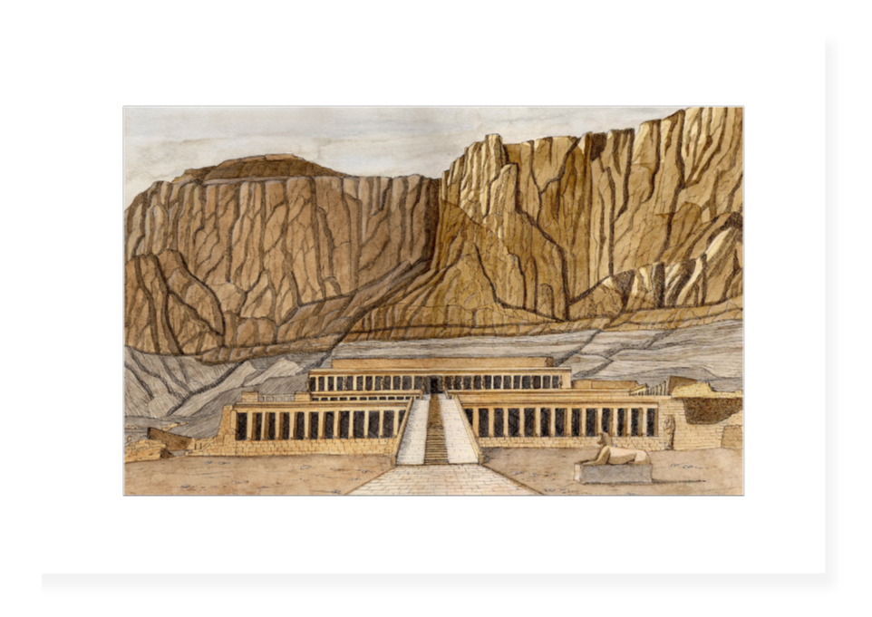 Érigé au XVe siècle avant J.-C. à Deir el-Bahari, le temple d’Hatchepsout est un chef-d’œuvre de l’architecture funéraire égyptienne. Conçu pour glorifier le règne de la reine et assurer sa mémoire, il se déploie en terrasses successives, harmonieusement intégrées à la falaise. Cette illustration restitue la monumentalité et la rigueur géométrique du site, tout en mettant en lumière la délicatesse des proportions et le dialogue entre pierre et lumière.
